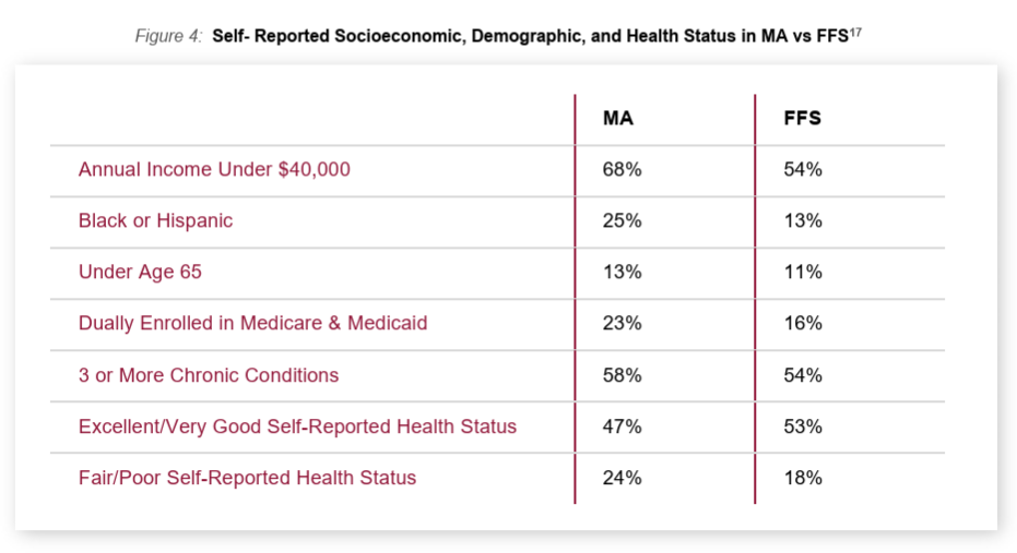 - Figure 4 of the HLC report below shows that MA enrolls lower income, more diverse, and more medically complex populations than FFS. Further, as of 2021, MA had a majority of dual eligibles. HLC says the increased enrollment of individuals with complex care needs runs counter to MedPAC’s premise of favorable selection in MA. It notes that those with ESRD are not included in the MedPAC analysis.